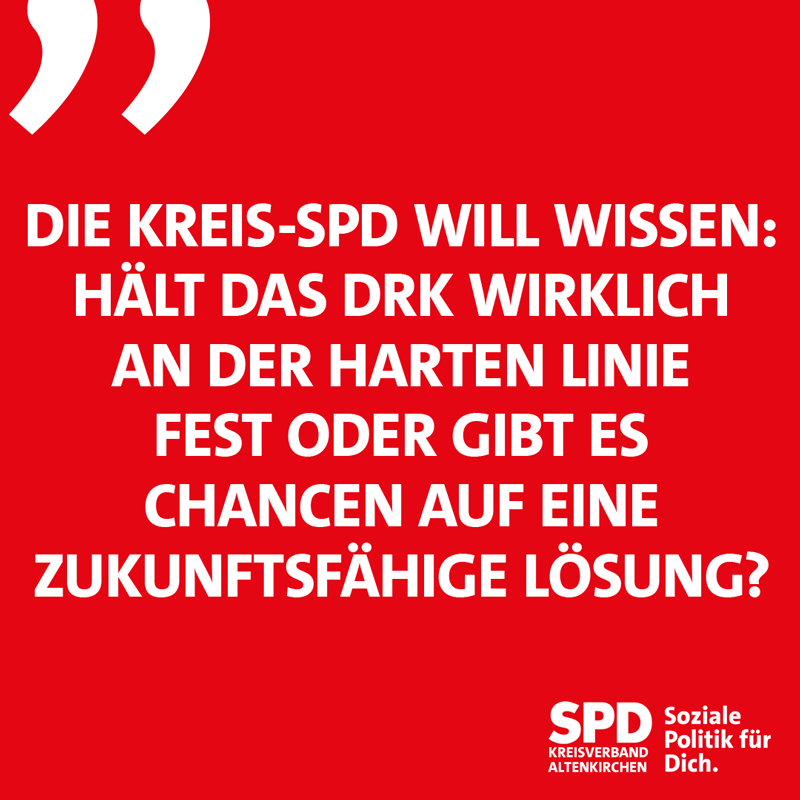 Gibt es Chancen auf eine zukunftsfähige Lösung? „Wir gehen davon aus, dass das nicht wahr ist“. Die SPD-Kreistagsfraktion, der SPD-Kreisverband und die Landtagsabgeordnete Sabine Bätzing-Lichtenthäler reagieren mit Unverständnis auf die vor Ort kursierende Ankündigung des DRK, den ursprünglichen Sanierungsplan für den Standort Altenkirchen ohne Anpassungen zu vollziehen. So könnte es nach internen Informationen schon im Dezember zu Kündigungen kommen.